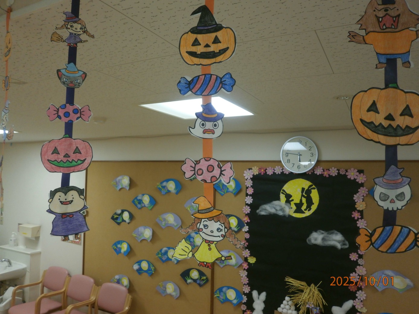 壁の貼り絵も天井からのぶら下がりも華やかで楽しそうな雰囲気でいっぱいです。
